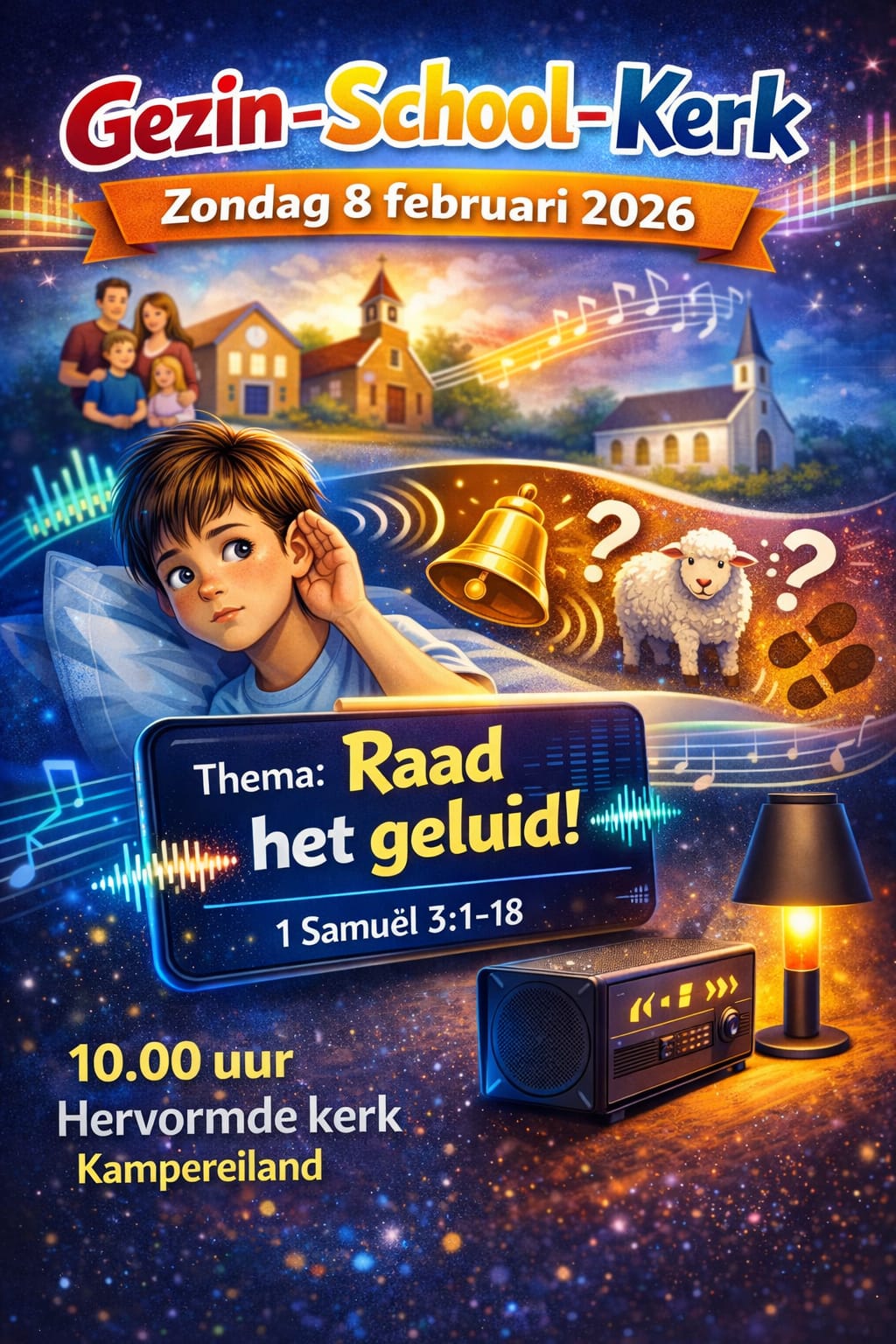 zo 08 feb 2026 om 10:00 De dienst zal in het teken staan van Gezin-School-Kerk. Het thema is: Een stem in het donker. Na de dienst willen we met elkaar koffiedrinken.Informatie kerkdiensten